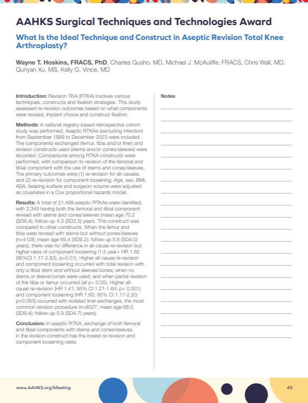 “Receiving the 2025 AAHKS Surgical Techniques and Technology Award is a profound honor that underscores the importance of our work in advancing orthopedic care. This study was a collaborative effort with Charles Gusho from the University of Missouri, Michael Mcauliffe, Chris Wall and Andie Xu from the AOANJRR, and Kelly Vince from Whangarei Hospital, driven by a passion to improve patient outcomes through rigorous research. The findings have reshaped my practice by reinforcing the value of evidence-based techniques and implant choices. This recognition inspires me to continue pushing future research efforts to improve revision total knee arthroplasty outcomes,” said Wayne T. Hoskins, FRACS, senior author on the paper.