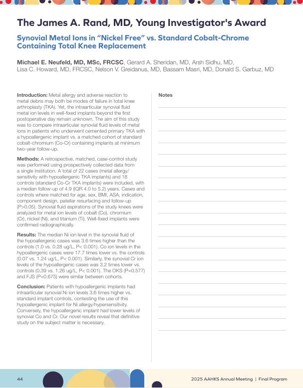 Oct. 25, 2025 (Dallas, TX) – An award-winning study was presented at the 2025 AAHKS Annual Meeting: Synovial Metal Ions in “Nickel Free” vs. Standard Cobalt-Chrome Containing Total Knee Replacement. This study received the AAHKS James A. Rand, MD, Young Investigator’s Award, which recognizes young investigators who demonstrate clinical excellence in knee-related research.